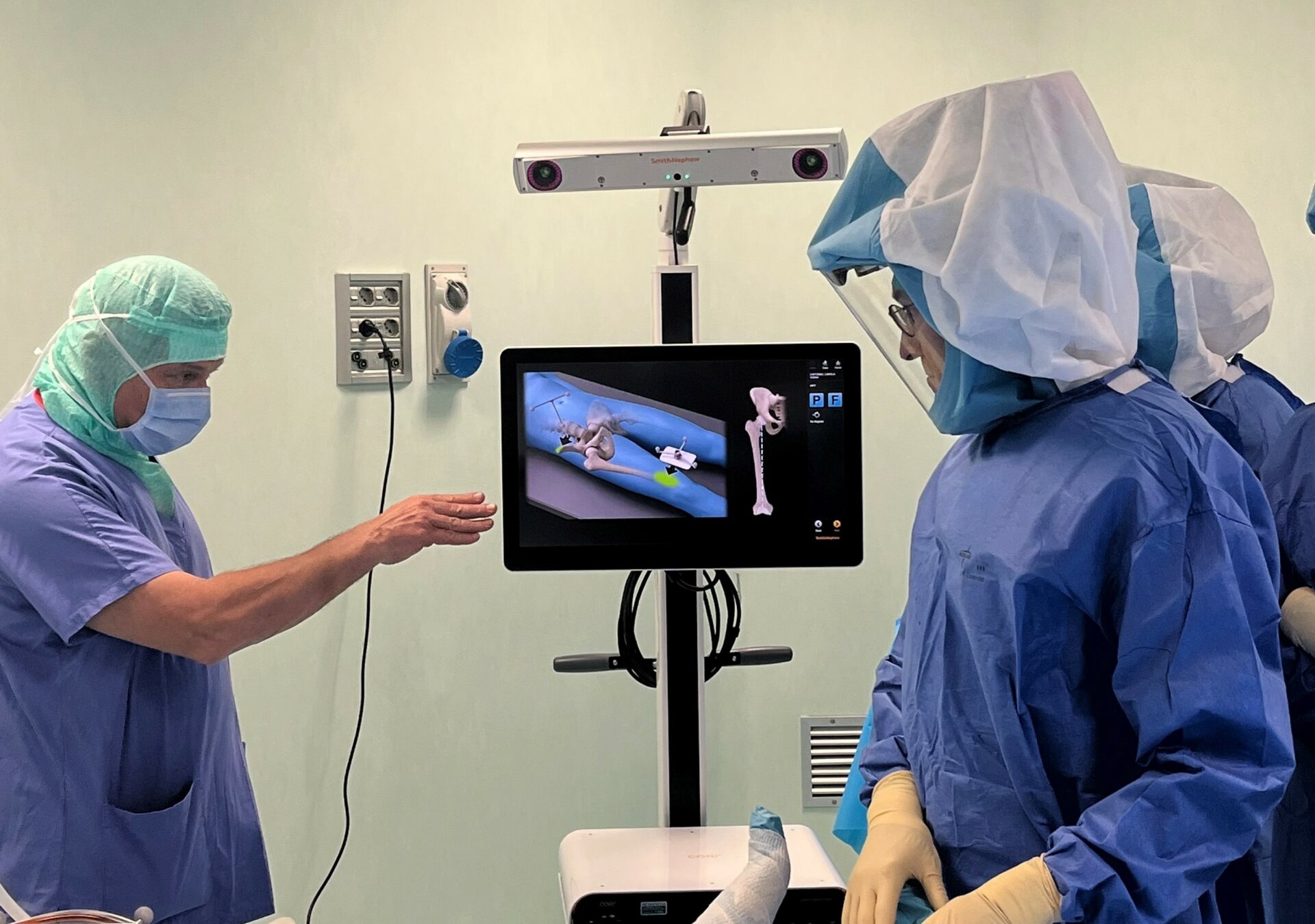 Il chirurgo procede con l’intervento con il supporto del robot che, grazie a sensori applicati sul bacino e sulla coscia, controlla in tempo reale che il posizionamento della protesi sia corrispondente a quanto stabilito nel corso della simulazione.