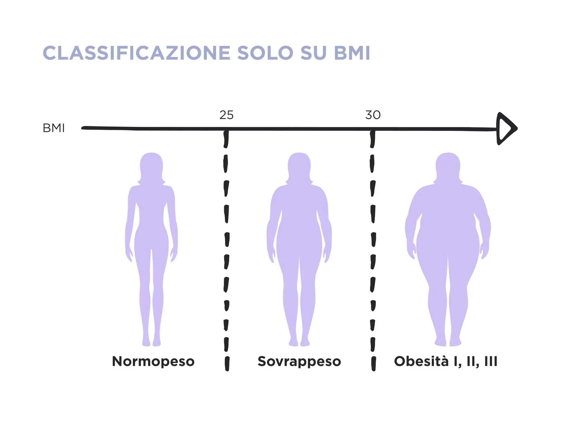Con il BMI, o indice di massa corporea, è possibile ottenere indicazioni sullo stato di salute senza però raggiungere una vera e propria diagnosi di sovrappeso o di obesità dal momento che non fornisce, per esempio, indicazioni sulla distribuzione del grasso corporeo e non è in grado di distinguere tra massa grassa e massa magra.