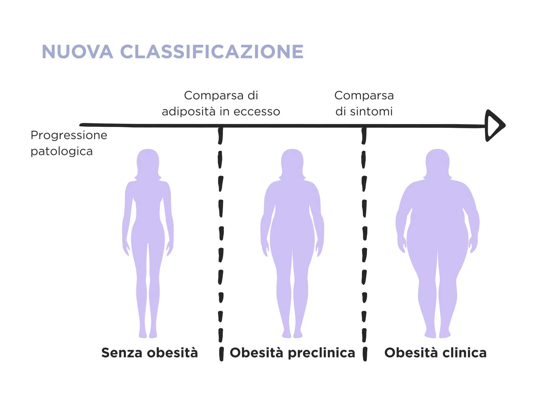 L’obesità preclinica è invece una condizione caratterizzata da eccesso di grasso corporeo che, pur non impattando direttamente sul funzionamento degli organi o sulle attività quotidiane, può comportare un aumento del rischio di evoluzione verso l’obesità clinica e quindi anche verso malattie a essa associate come patologie metaboliche, renali, cardiovascolari e alcuni tumori. È il caso, quindi di riservarle una particolare attenzione diagnostica e terapeutica.