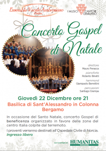 I proventi di questo concerto, organizzato con il sostegno di Humanitas Gavazzeni, saranno devoluti in favore delle zone del Centro Italia colpite dal terremoto, nello specifico saranno destinati all’Ospedale Civile di Norcia, duramente colpito dal sisma dello scorso ottobre.