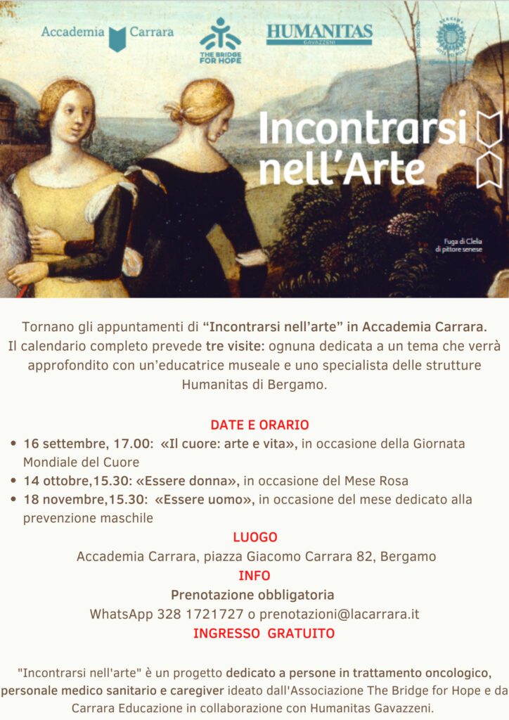 Dopo i successi delle scorse edizioni, Accademia Carrara insieme a The Bridge for Hope e Humanitas Gavazzeni propongono nuovamente i percorsi dal titolo Incontrarsi nell’arte, dedicati a persone in trattamento oncologico, familiari e caregivers e personale medico sanitario, per scoprire che cultura e benessere sono in relazione. Con una novità: nel nuovo ciclo di incontri con cadenza mensile, da settembre a novembre 2023, ad accompagnare i partecipanti alla scoperta delle opere della Carrara, sarà un’educatrice museale insieme a uno specialista degli ospedali Humanitas a Bergamo per mettere in comunicazione arte e cura.