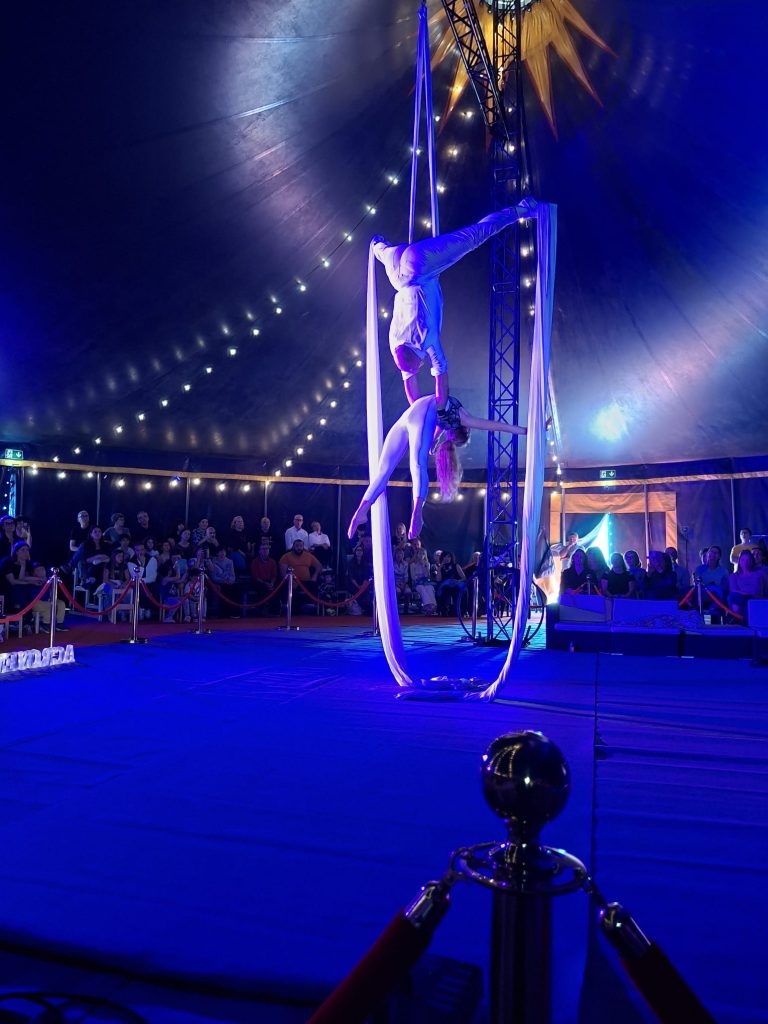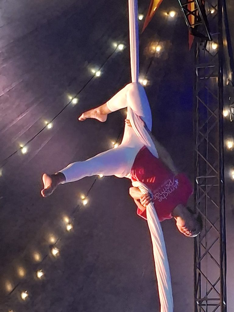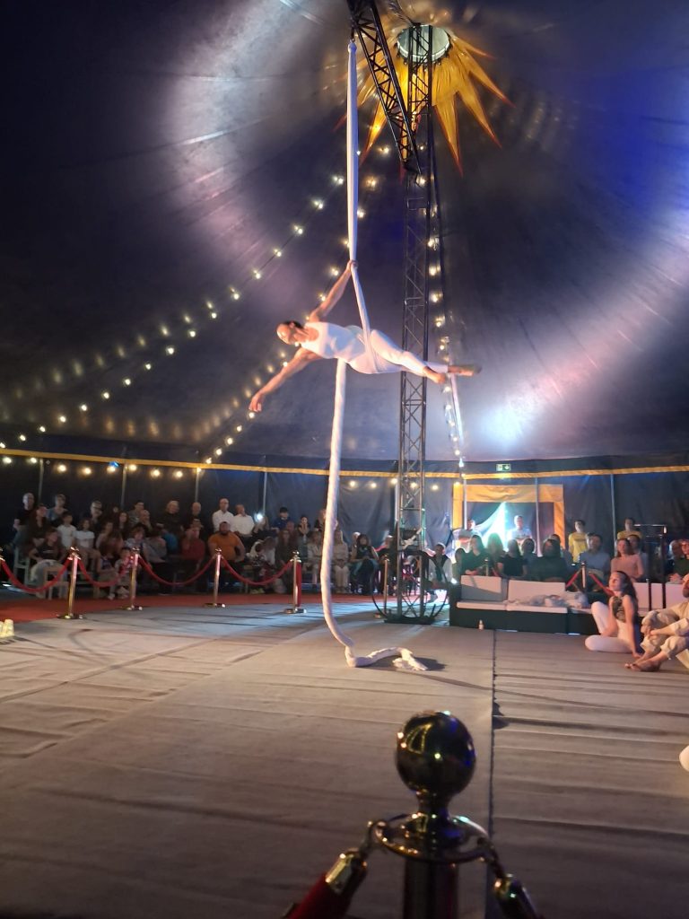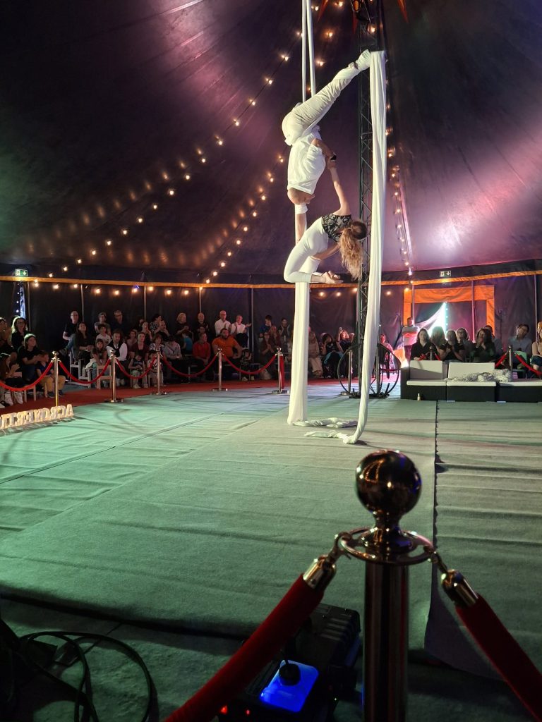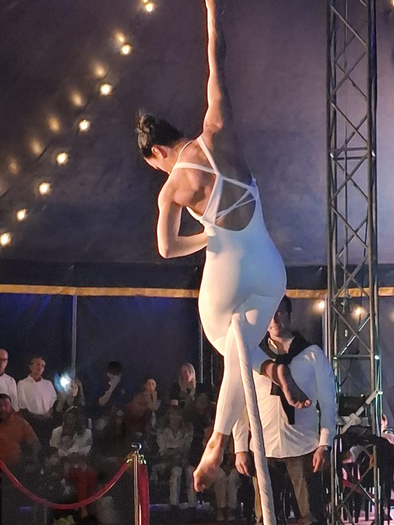 Per l’occasione, davanti a un pubblico numeroso di sostenitori e sostenitrici, la compagnia Acrovertical ha offerto uno spettacolo di grande impatto: atleti e atlete sospesi nel vuoto tra teli, reti e strutture geometriche, accompagnati da musica e canto dal vivo e da una voce narrante.