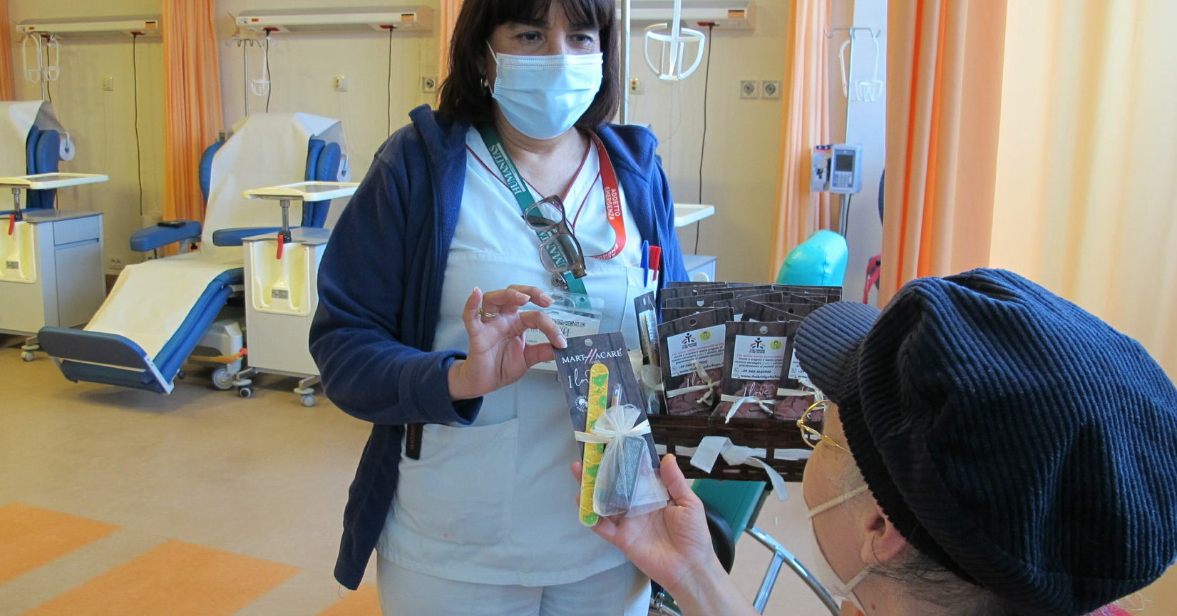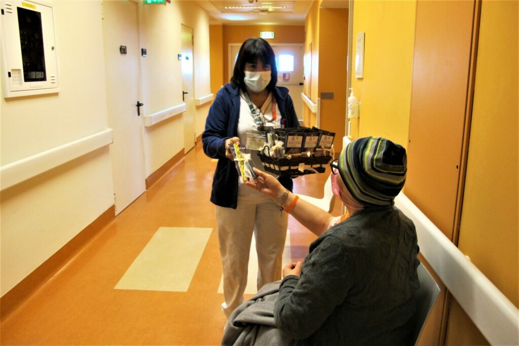 A fine o durante le lunghe ore previste dal trattamento di cura, sono stati regalati prodotti per il viso, grazie al sostegno dell’associazione di volontariato The Bridge for Hope che da anni fa parte dell’ ospedale, e coccole di bellezza con una seduta di trucco e massaggio alle mani, grazie al lavoro di due volontarie di Amiche per Mano, associazione di volontariato nata nel 2016 da donne e con donne che lottano contro il carcinoma mammario all’interno dell’Unità di Senologia di Humanitas Gavazzeni.