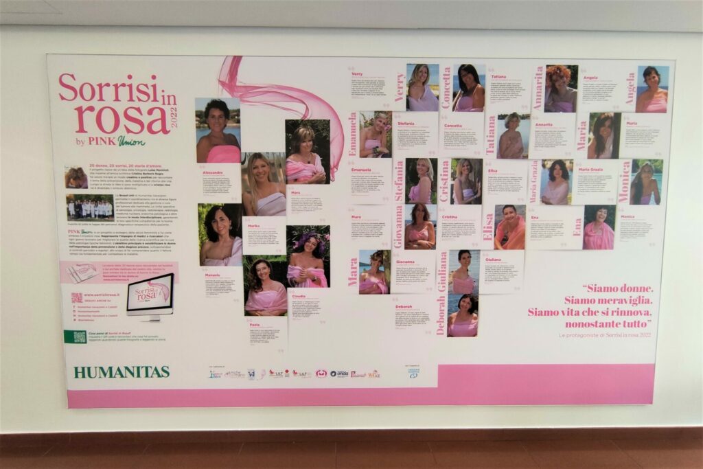 Il progetto di prevenzione senologica “Sorrisi in Rosa” è nato sette anni fa da un’idea dei senologi di Humanitas in collaborazione con la fotografa Luisa Morniroli e la scrittrice Cristina Barberis Negra, entrambe ex pazienti, e oggi coinvolge oltre 100 donne da Torino a Catania, da Milano a Bergamo e Varese. Sono loro le protagoniste della mostra fotografica “Sorrisi in Rosa” che veste le sale d’attesa di tutti gli ospedali e dei centri medici Humanitas italiani, e ora inaugurata anche nell’atrio dell’aula Pio XI in Università Cattolica. Alle foto si aggiungono racconti sul sito, un libro (Sorrisi in Fiore), podcast ed eventi di prevenzione, in collaborazione con Fondazione Humanitas per la Ricerca.