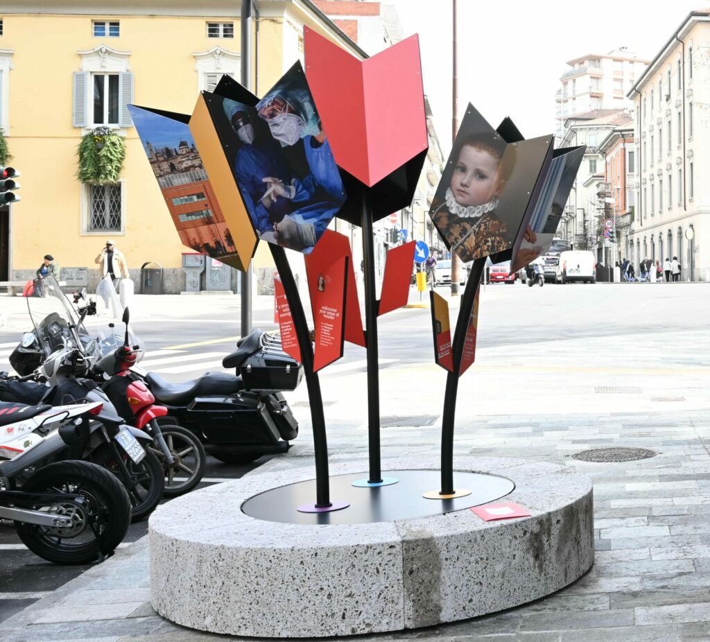 Uno in via Zambonate 11, in centro Bergamo, inaugurato lunedì 13 marzo alla presenza dell’amministratore delegato di Humanitas Gavazzeni e Castelli Alessandro Liguori, il sindaco di Bergamo Giorgio Gori e Gianpietro Bonaldi, general manager della Fondazione Accademia Carrara, che colorerà per tutto il 2023 la via in centro città grazie ai suoi petali che raccontano, attraverso le immagini, i capolavori conservati in Accademia Carrara e la vita nei due ospedali bergamaschi tra volti di operatori sanitari e camici ospedalieri avvolti, sempre, dall’arte che ricopre le pareti di reparti, sale d’attesa e corridoi ospedalieri. Per un continuo scambio e legame tra arte e cura, tra bellezza salvifica e rinascita.